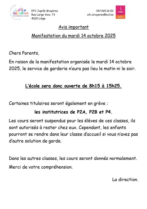 Veuillez noter qu'en raison de la manifestation de ce mardi 14 octobre, il n'y aura pas de service de garderie.